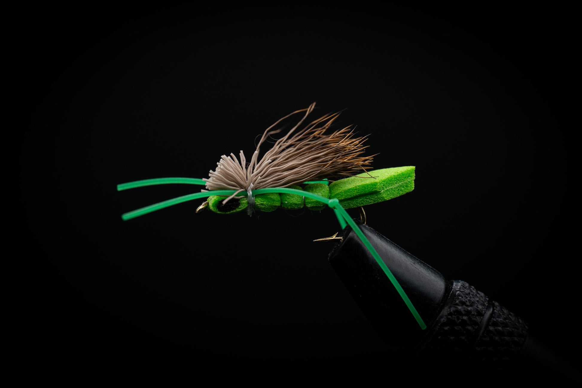 Imitates small grasshoppers, beetles, or leafhoppers, with a green foam body offering visibility and floatation.