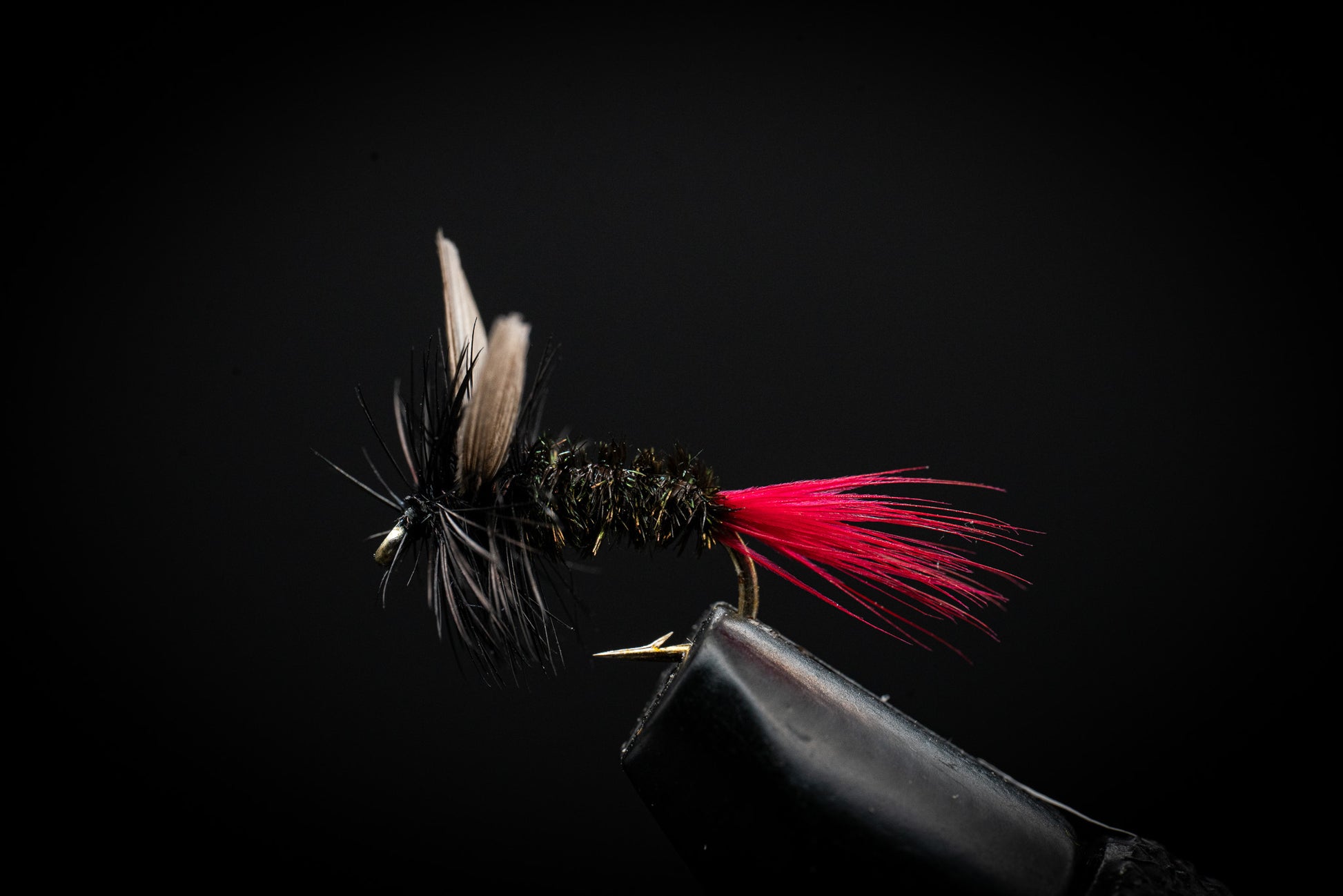 The Black Gnat Red Tail is a variant of the classic Black Gnat, a fly pattern with origins in the 1800s. The addition of the red tail likely developed in the early to mid-20th century as fly tiers began experimenting with attractor elements to increase a fly’s visibility and trigger response strikes. Similar to the use of red tags or tails in other traditional patterns (like the Red Tag or Royal Coachman), the red tail adds an element of visual stimulation while preserving the effectiveness of the original Black Gnat’s profile. This version has remained a favorite in both wet and dry forms for anglers targeting trout and panfish, particularly when fish are feeding opportunistically.