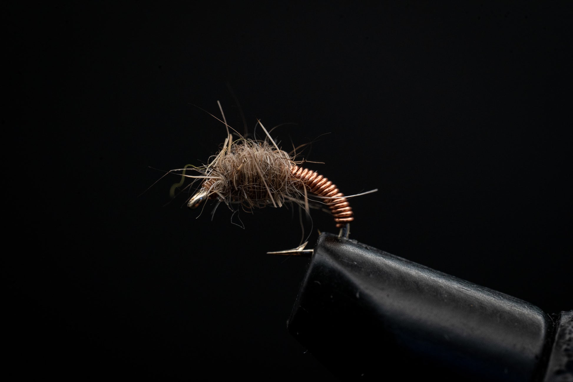 A hybrid pattern that imitates mayfly nymphs, caddis larvae, and small stoneflies. The body combines hare’s ear dubbing and copper wire, adding both bugginess and segmentation.