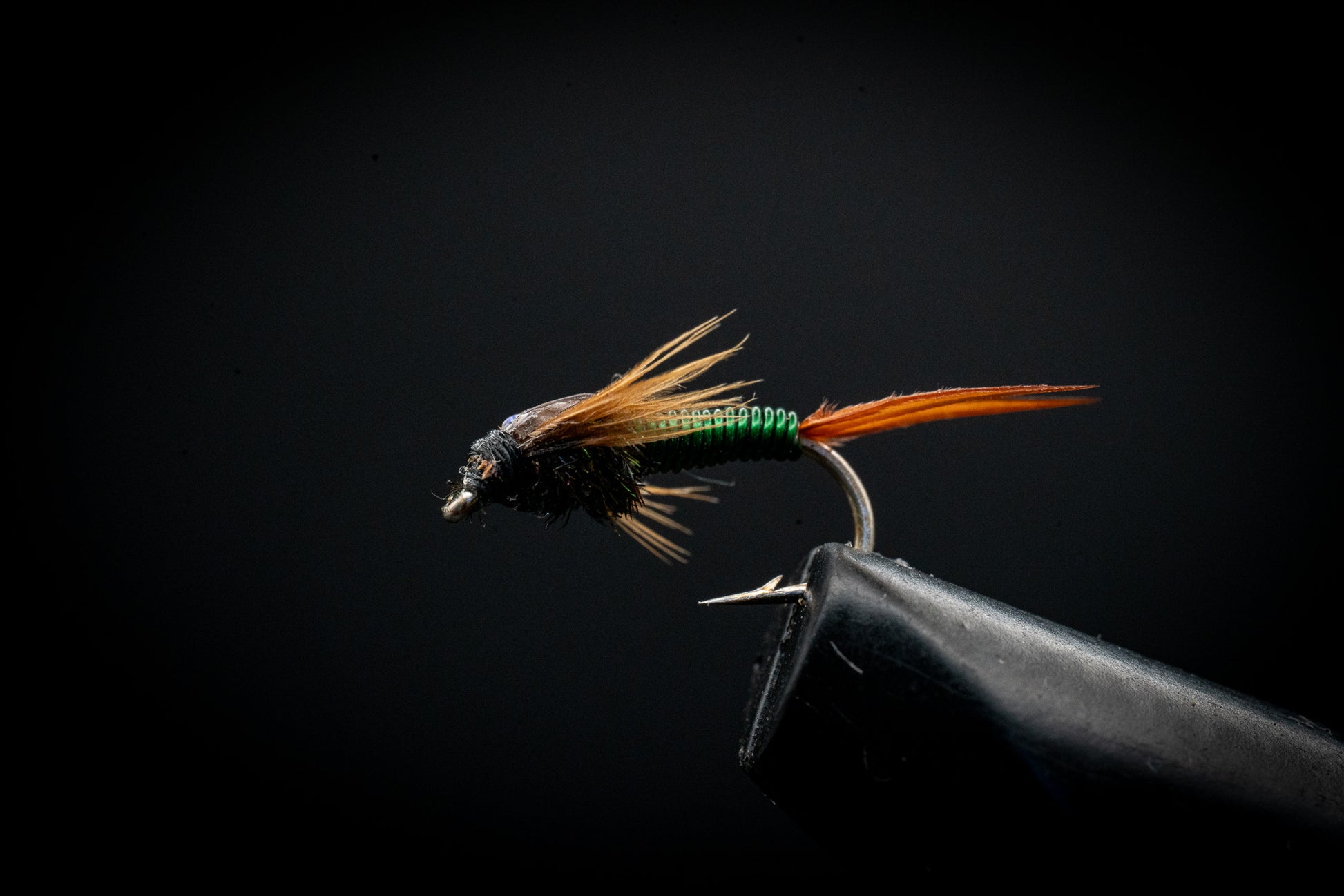 Imitates green caddis larvae, particularly Hydropsyche and Rhyacophila species, and also functions as a mayfly nymph.