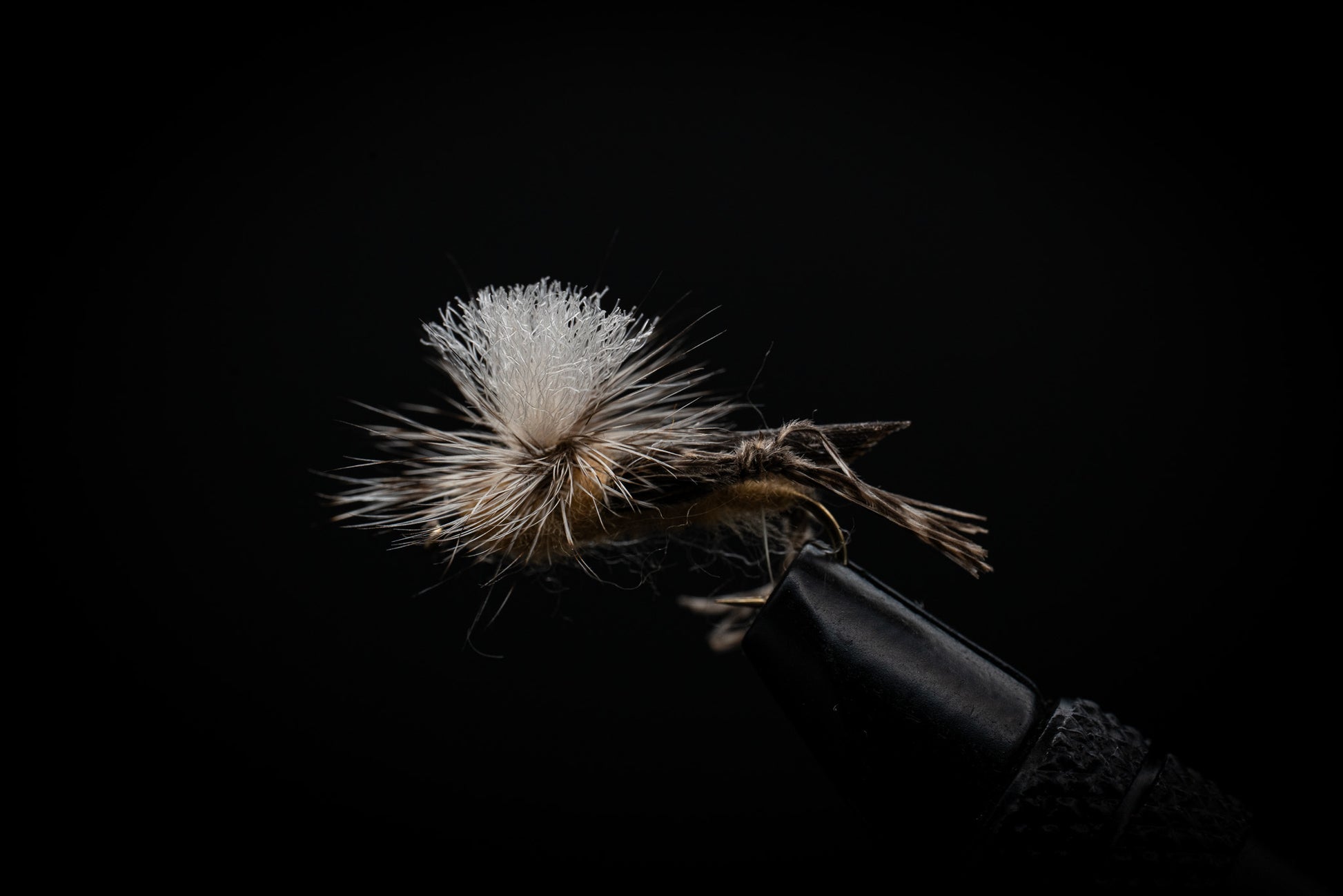 A more delicate and low-profile imitation of a tan grasshopper or leafhopper, using parachute hackle for flatter landings.