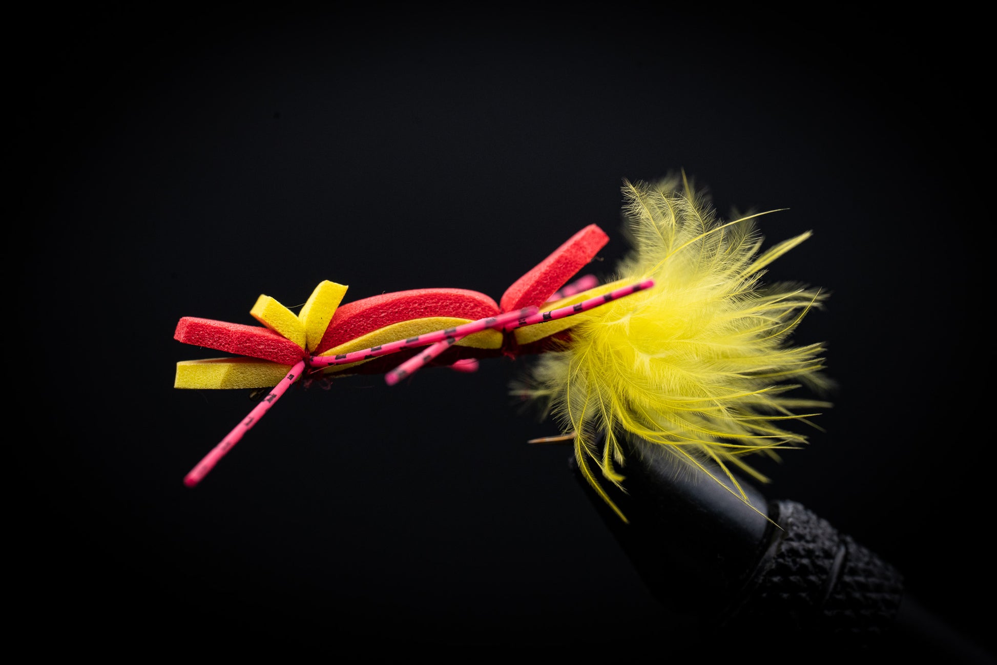 This fly blends traditional materials with exaggerated features—typically bright colors and rubber legs—for a fun and functional hopper imitation.
