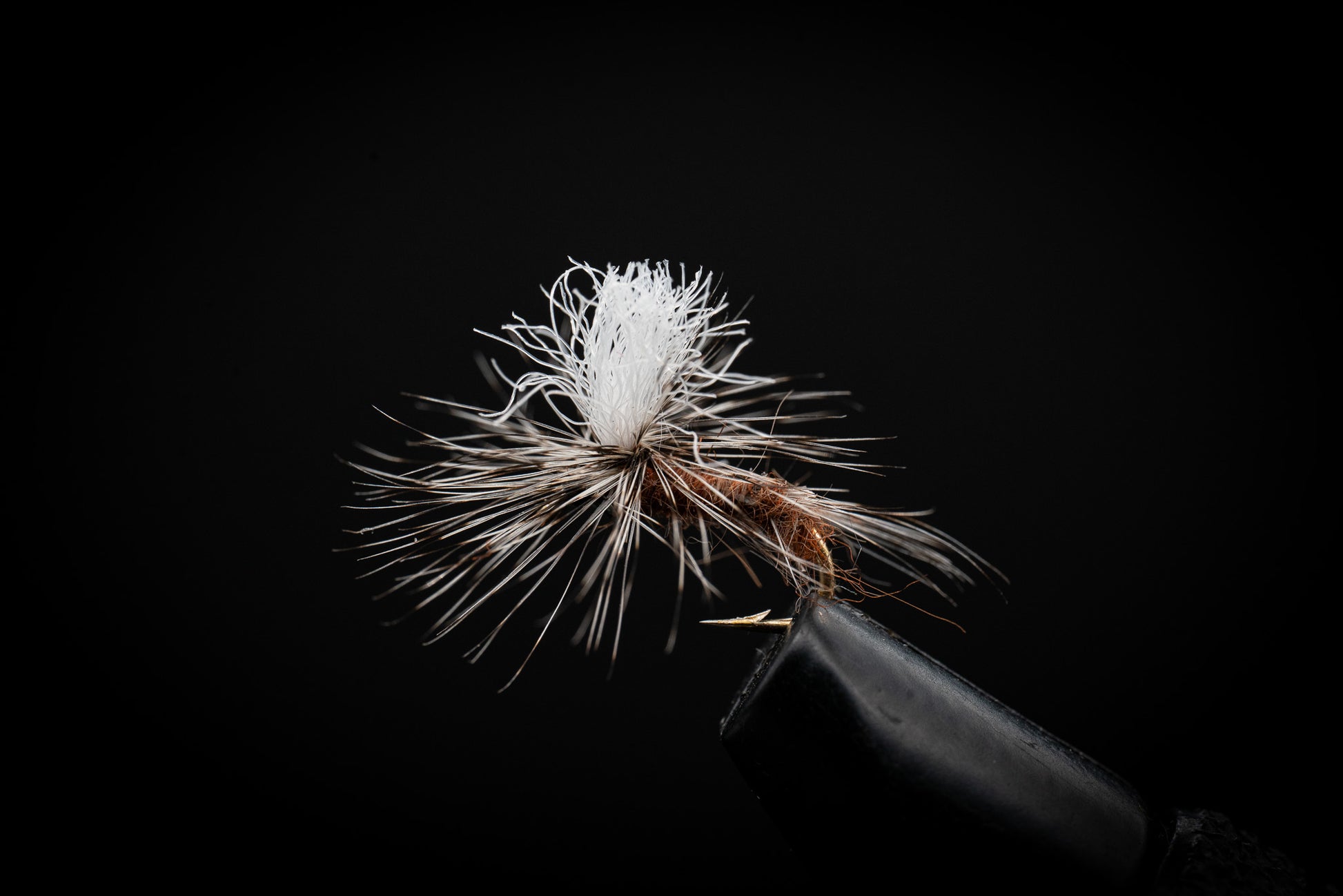 The Rusty Spinner Parachute imitates spent or dying adult mayflies—especially PMDs, Sulphurs, and Cahills—which take on a reddish-brown or rusty hue during spinner falls. The parachute form offers realistic presentation and visibility during low-light fishing.